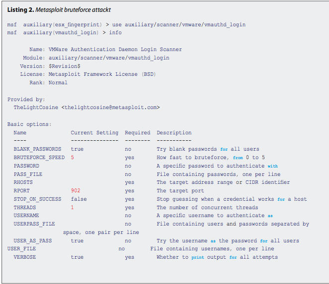 Giờ ta đã xác định được thông tin về máy chủ và phiên bản VMware, nhìn vào đó chúng ta có thể đoán trước được khả năng khai thác thành công. Có khá nhiều sự lựa chọn; tuy nhiên chúng ta  sẽ thử phương pháp dùng Metasploit để Bruteforce tài khoản đăng nhập vào ESXi!