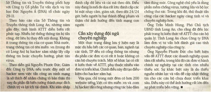 Một thực trạng đáng lưu ý hiện nay là mặc dù hầu hết các cơ quan, ban, ngành tại các tỉnh, TP đều có cổng thông tin nhưng đa phần các đơn vị có rất ít hoặc không có cán bộ chuyên trách. Một số khác lại có rất ít kiến thức về ATTT, phụ thuộc nhiều vào đơn vị triển khai. Chính điều này đã tạo điều kiện cho hacker xâm hại.